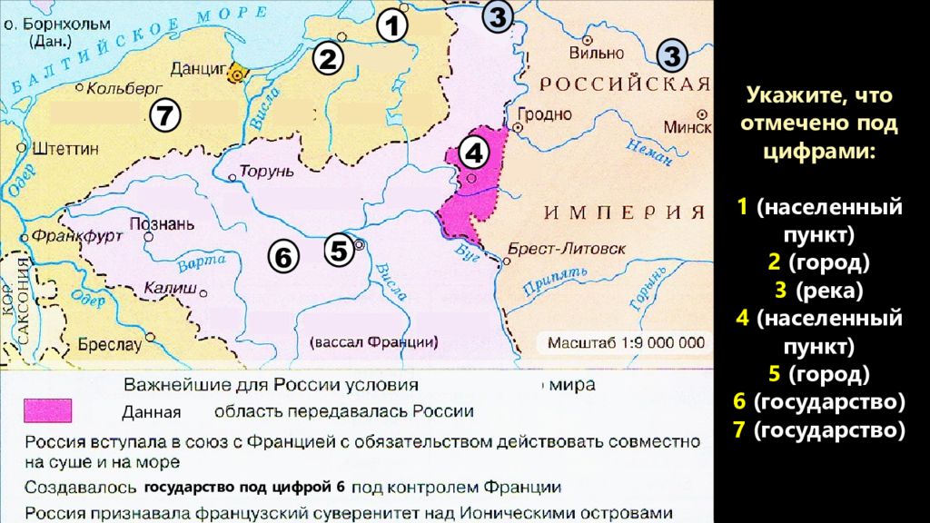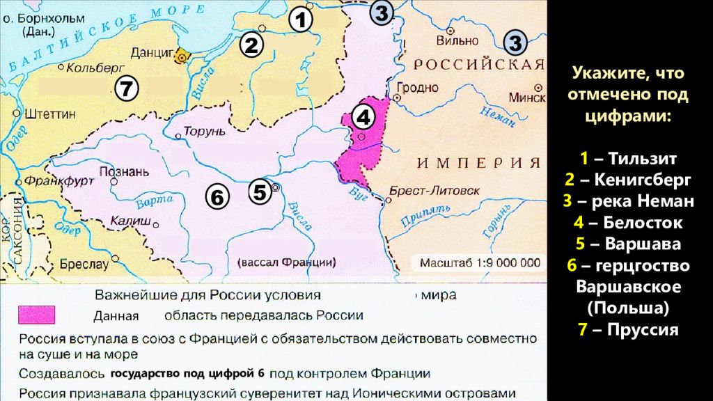 Укажите, что отмечено под цифрами: 1 – Тильзит 2 – Кенигсберг 3 – река Неман 4 – Белосток 5 – Варшава 6 – герцгоство Варшавское (Польша) 7 – Пруссия 1 3 3 4 Данная 5 6 2 государство под цифрой 6 7