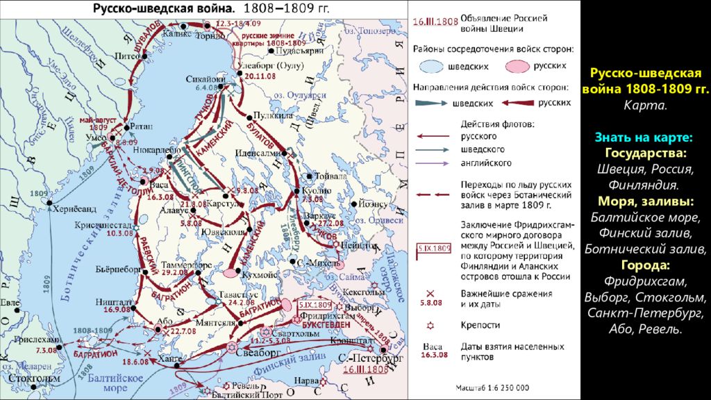 Русско-шведская война 1808-1809 гг. Карта. Знать на карте: Государства: Швеция, Россия, Финляндия. Моря, заливы: Балтийское море, Финский залив, Ботнический залив, Города: Фридрихсгам, Выборг, Стокгольм, Санкт-Петербург, Або, Ревель.