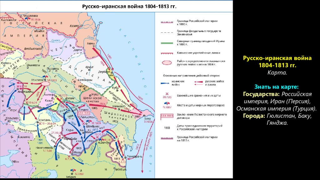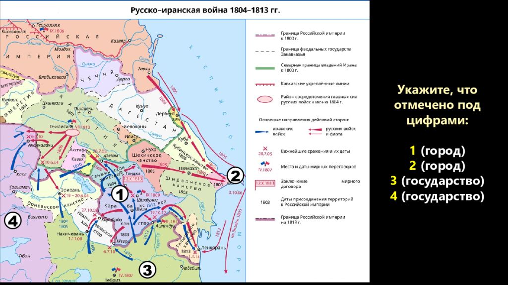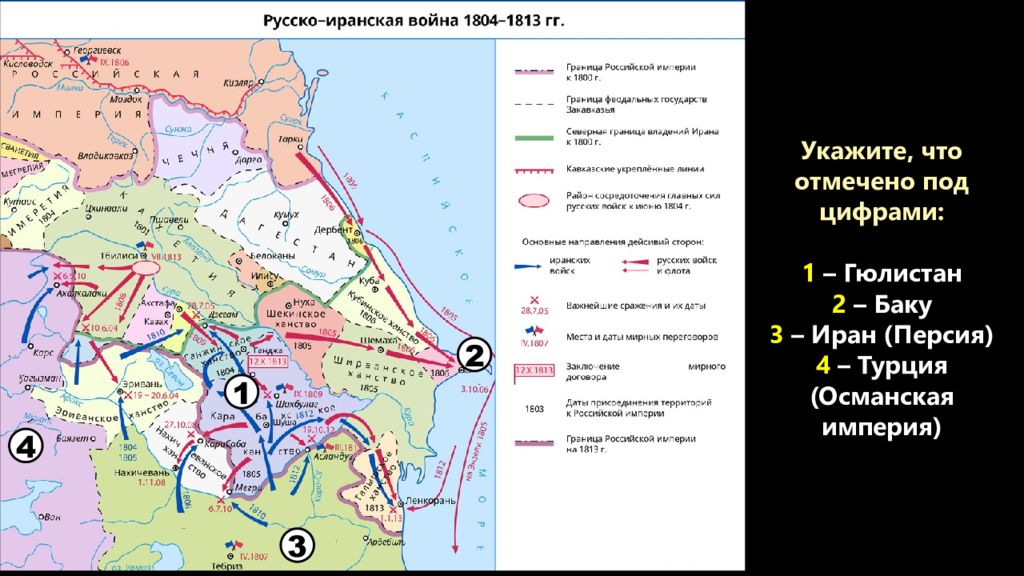 Укажите, что отмечено под цифрами: 1 – Гюлистан 2 – Баку 3 – Иран (Персия) 4 – Турция (Османская империя) 1 2 3 4