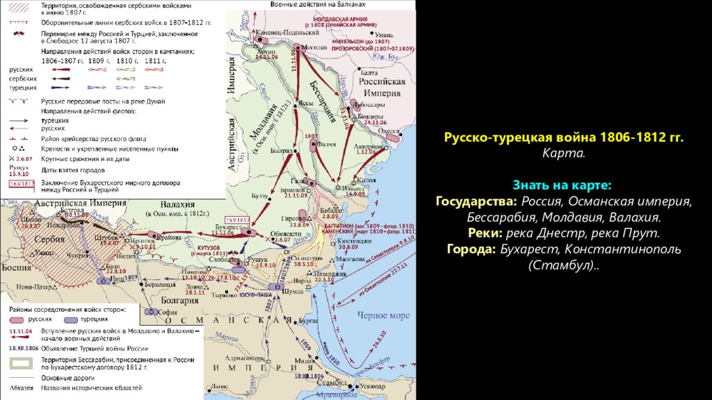 Русско-турецкая война 1806-1812 гг. Карта. Знать на карте: Государства: Россия, Османская империя, Бессарабия, Молдавия, Валахия. Реки: река Днестр, река Прут. Города: Бухарест, Константинополь (Стамбул)..