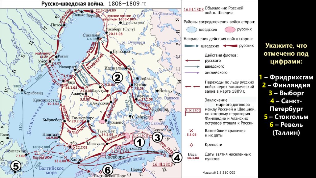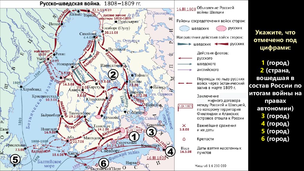 Укажите, что отмечено под цифрами: 1 (город) 2 (страна, вошедшая в состав России по итогам войны на правах автономии) 3 (город) 4 (город) 5 (город) 6 (город) 1 2 3 4 5 6