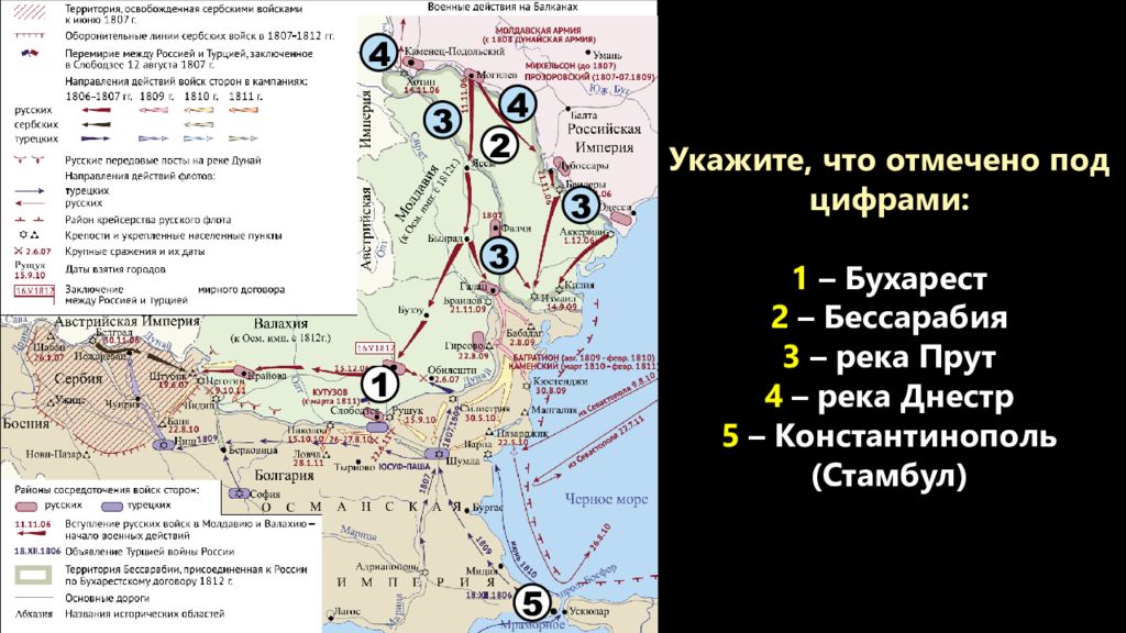 1 2 3 3 4 4 3 5 Укажите, что отмечено под цифрами: 1 – Бухарест 2 – Бессарабия 3 – река Прут 4 – река Днестр 5 – Константинополь (Стамбул)