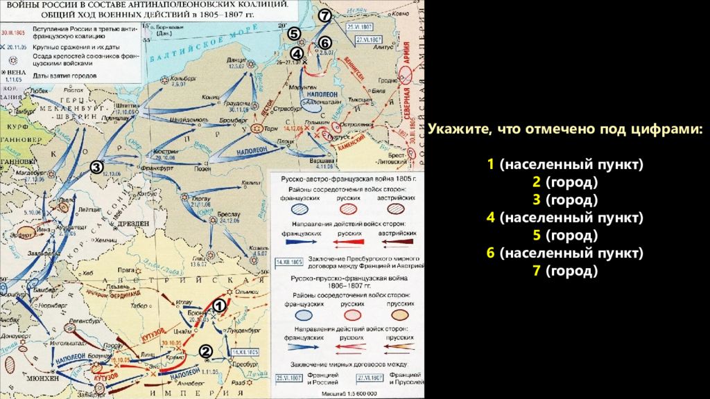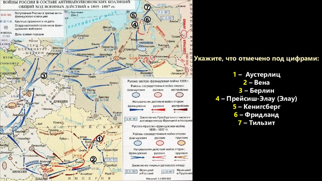 1 2 3 5 4 6 7 Укажите, что отмечено под цифрами: 1 – Аустерлиц 2 – Вена 3 – Берлин 4 – Прейсиш-Элау ( Элау ) 5 – Кенигсберг 6 – Фридланд 7 – Тильзит
