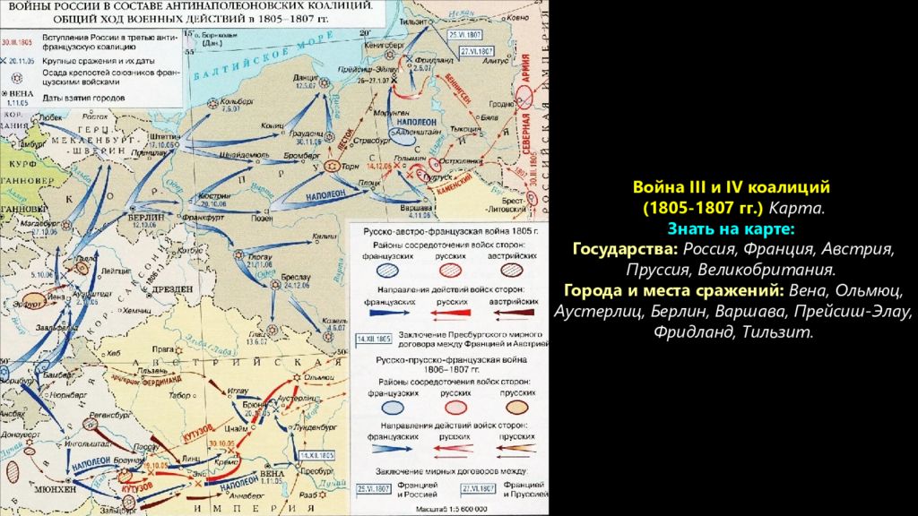 Война III и IV коалиций (1805-1807 гг.) Карта. Знать на карте: Государства: Россия, Франция, Австрия, Пруссия, Великобритания. Города и места сражений: Вена, Ольмюц, Аустерлиц, Берлин, Варшава, Прейсиш-Элау, Фридланд, Тильзит.