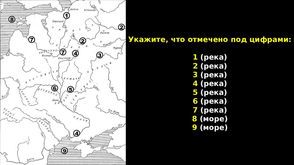 Укажите, что отмечено под цифрами: 1 (река) 2 (река) 3 (река) 4 (река) 5 (река) 6 ( река ) 7 (река) 8 ( море ) 9 (море) 1 2 2 3 4 4 5 6 7 7 8 9