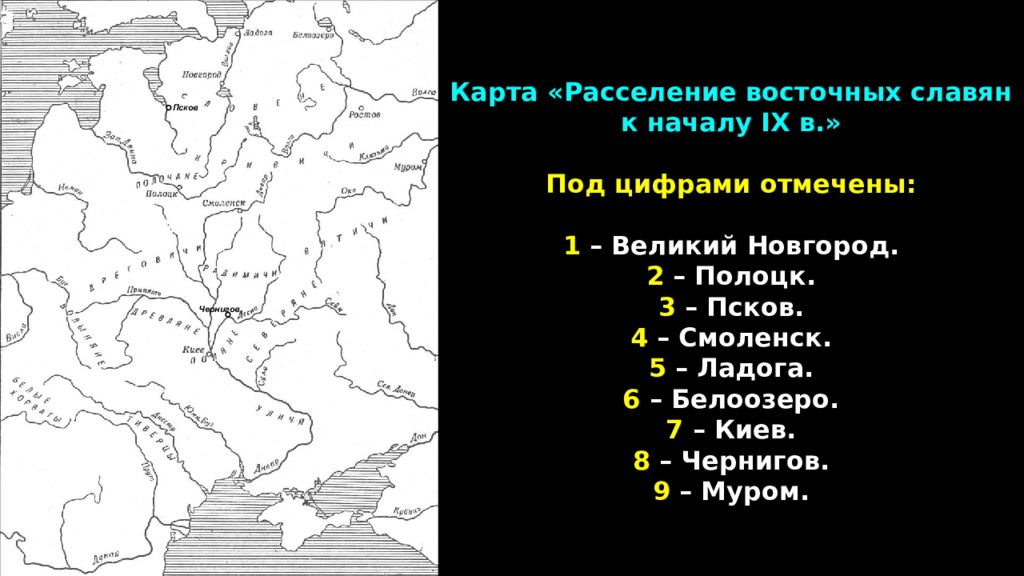 Карта «Расселение восточных славян к началу IX в.» Под цифрами отмечены: 1 – Великий Новгород. 2 – Полоцк. 3 – Псков. 4 – Смоленск. 5 – Ладога. 6 – Белоозеро. 7 – Киев. 8 – Чернигов. 9 – Муром. Псков Чернигов