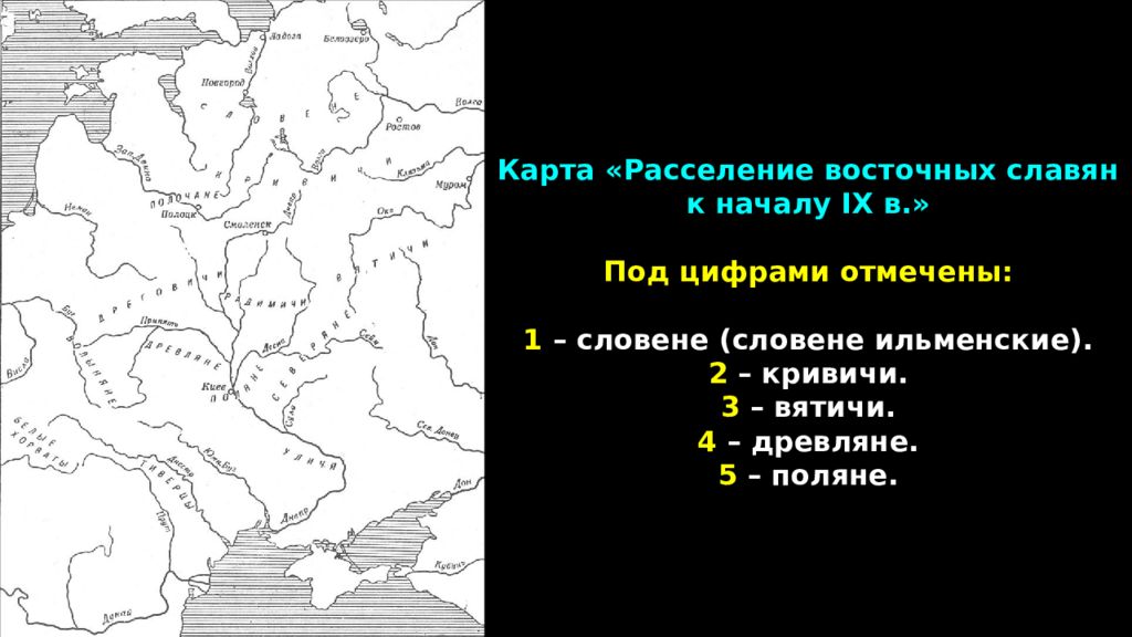 Карта «Расселение восточных славян к началу IX в.» Под цифрами отмечены: 1 – словене (словене ильменские). 2 – кривичи. 3 – вятичи. 4 – древляне. 5 – поляне.
