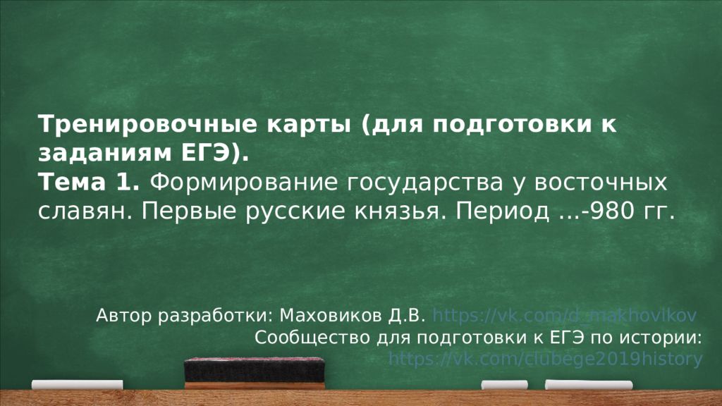 Автор разработки: Маховиков Д.В. https://vk.com/d_makhovikov Сообщество для подготовки к ЕГЭ по истории: https://vk.com/clubege2019history Тренировочные карты (для подготовки к заданиям ЕГЭ). Тема 1. Формирование государства у восточных славян. Первые русские князья. Период...-980 гг.