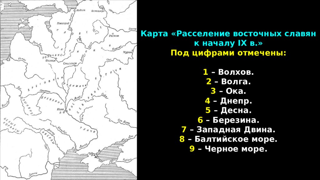 Карта «Расселение восточных славян к началу IX в.» Под цифрами отмечены : 1 – Волхов. 2 – Волга. 3 – Ока. 4 – Днепр. 5 – Десна. 6 – Березина. 7 – Западная Двина. 8 – Балтийское море. 9 – Черное море.