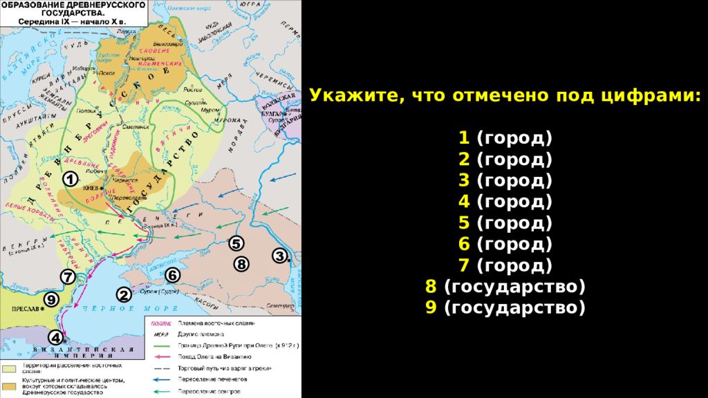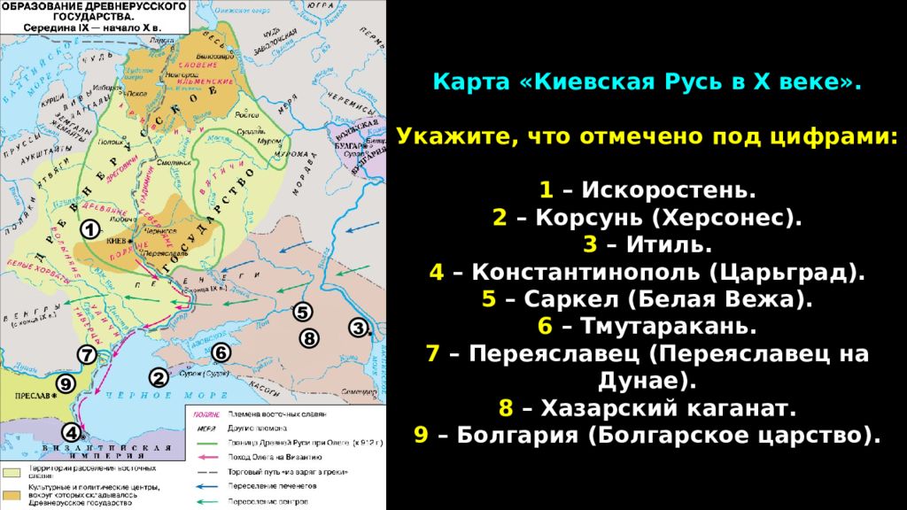1 2 4 5 6 8 7 3 9 Карта «Киевская Русь в X веке». Укажите, что отмечено под цифрами: 1 – Искоростень. 2 – Корсунь (Херсонес). 3 – Итиль. 4 – Константинополь (Царьград). 5 – Саркел (Белая Вежа). 6 – Тмутаракань. 7 – Переяславец ( Переяславец на Дунае). 8 – Хазарский каганат. 9 – Болгария (Болгарское царство).