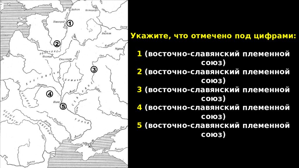 1 Укажите, что отмечено под цифрами: 1 (восточно-славянский племенной союз) 2 (восточно-славянский племенной союз) 3 ( восточно-славянский племенной союз ) 4 ( восточно-славянский племенной союз ) 5 ( восточно-славянский племенной союз ) 2 3 4 5