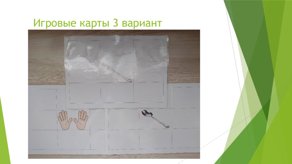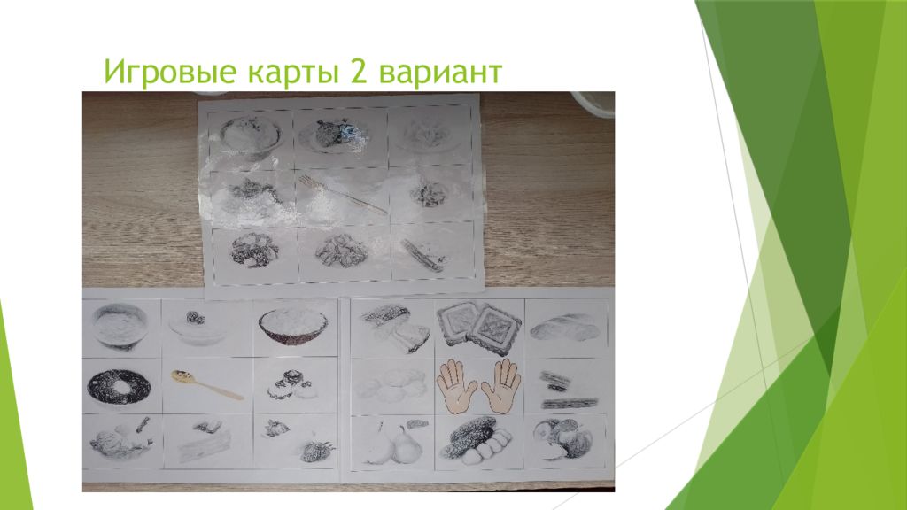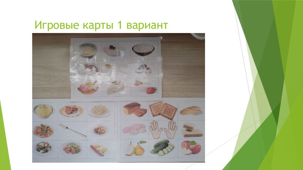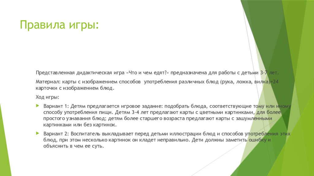 Представленная дидактическая игра «Что и чем едят?» предназначена для работы с детьми 3-7 лет. Материал: карты с изображением способов употребления различных блюд (рука, ложка, вилка )+24 карточки с изображением блюд. Ход игры: Вариант 1: Детям предлагается игровое задание: подобрать блюда, соответствующие тому или иному способу употребления пищи. Детям 3-4 лет предлагают карты с цветными картинками, для более простого узнавания блюд; детям более старшего возраста предлагают карты с зашумленными картинками или без картинок. Вариант 2: Воспитатель выкладывает перед детьми иллюстрации блюд и способов употребления этих блюд, при этом несколько картинок он кладет неправильно. Дети должны заметить ошибку и объяснить в чем ее суть.