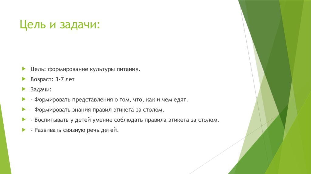 Цель: формирование культуры питания. Возраст: 3-7 лет Задачи: - Формировать представления о том, что, как и чем едят. - Формировать знания правил этикета за столом. - Воспитывать у детей умение соблюдать правила этикета за столом. - Развивать связную речь детей.