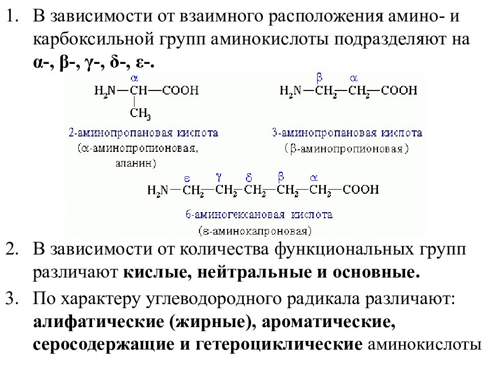 В зависимости от взаимного расположения амино- и карбоксильной групп аминокислоты подразделяют на α -, β -, γ -, δ -, ε -. В зависимости от количества функциональных групп различают кислые, нейтральные и основные. По характеру углеводородного радикала различают: алифатические (жирные), ароматические, серосодержащие и гетероциклические аминокислоты