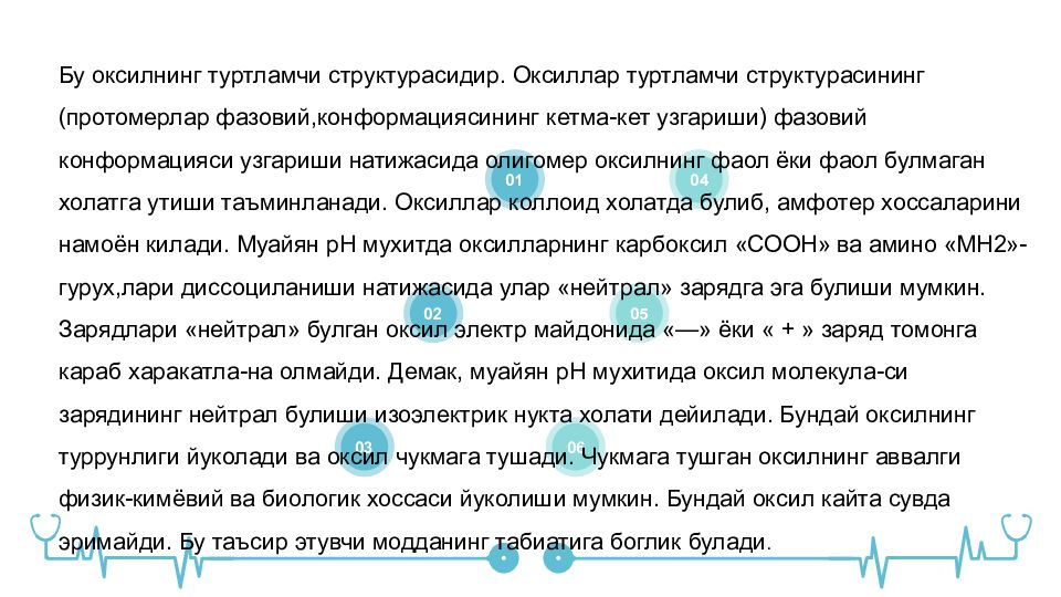 04 05 06 01 02 03 Бу оксилнинг туртламчи структурасидир. Оксиллар туртламчи структурасининг ( протомерлар фазовий,конформациясининг кетма -кет узгариши ) фазовий конформацияси узгариши натижасида олигомер оксилнинг фаол ёки фаол булмаган холатга утиши таъминланади. Оксиллар коллоид холатда булиб, амфотер хоссаларини намоён килади. Муайян рН мухитда оксилларнинг карбоксил «СООН» ва амино «МН2»-гурух,лари диссоциланиши натижасида улар «нейтрал» зарядга эга булиши мумкин. Зарядлари «нейтрал» булган оксил электр майдонида «—» ёки « + » заряд томонга караб харакатла -на олмайди. Демак, муайян рН мухитида оксил молекула-си зарядининг нейтрал булиши изоэлектрик нукта холати дейилади. Бундай оксилнинг туррунлиги йуколади ва оксил чукмага тушади. Чукмага тушган оксилнинг аввалги физик- кимёвий ва биологик хоссаси йуколиши мумкин. Бундай оксил кайта сувда эримайди. Бу таъсир этувчи модданинг табиатига боглик булади.