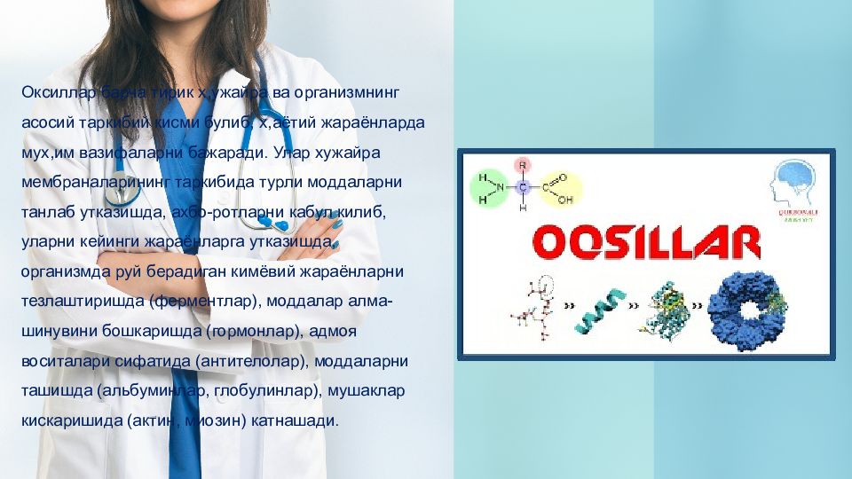 Оксиллар барча тирик х,ужайра ва организмнинг асосий таркибий кисми булиб, х,аётий жараёнларда мух,им вазифаларни бажаради. Улар хужайра мембраналарининг таркибида турли моддаларни танлаб утказишда, ахбо-ротларни кабул килиб, уларни кейинги жараёнларга утказишда, организмда руй берадиган кимёвий жараёнларни тезлаштиришда ( ферментлар ), моддалар алма- шинувини бошкаришда ( гормонлар ), адмоя воситалари сифатида ( антителолар ), моддаларни ташишда ( альбуминлар, глобулинлар ), мушаклар кискаришида (актин, миозин) катнашади.