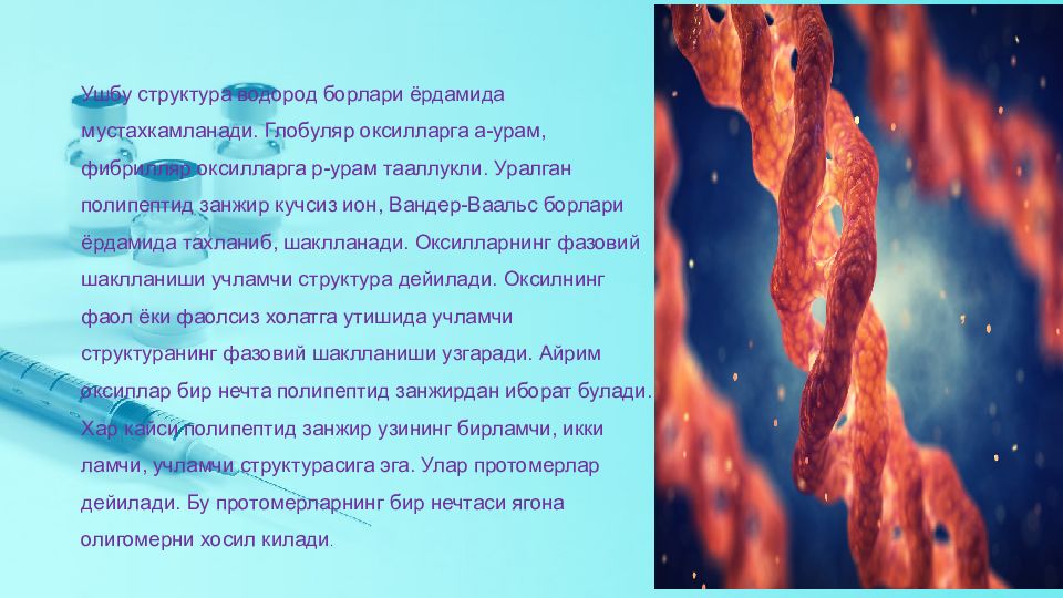 PowerPoint Presentation PowerPoint Presentation PowerPoint Presentation Оксиллар турт хил структурага ( тузилишга ) эга. Тегишли аминокислотанинг катъий тартиб билан, полипептид занжирда жойлашиши оксилнинг бирламчи структураси дейилади. Бу структура мустахкам пептид бог ёрдамида ушланиб туради. Бирламчи структура оксилларнинг хилма-хиллигини, кандай турга оид эканли-гини, физик- кимёвий хоссаларини ва кейинги структурала-рини белгилаб беради. Полипептид занжирнинг спиралланиши ( уралиши ),а- ёки р- урамни хосил килиши оксилнинг иккиламчи структураси дейилади.