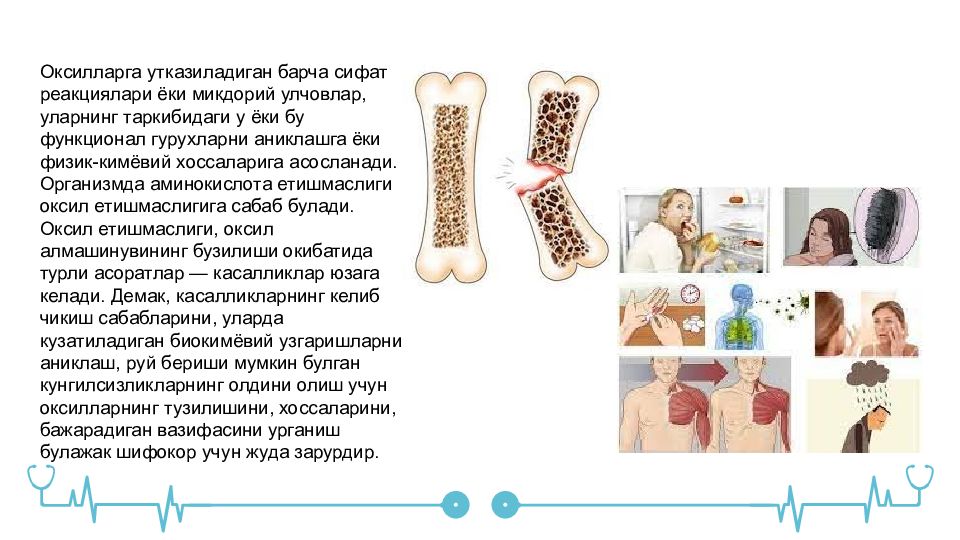Оксилларга утказиладиган барча сифат реакциялари ёки микдорий улчовлар, уларнинг таркибидаги у ёки бу функционал гурухларни аниклашга ёки физик- кимёвий хоссаларига асосланади. Организмда аминокислота етишмаслиги оксил етишмаслигига сабаб булади. Оксил етишмаслиги, оксил алмашинувининг бузилиши окибатида турли асоратлар — касалликлар юзага келади. Демак, касалликларнинг келиб чикиш сабабларини, уларда кузатиладиган биокимёвий узгаришларни аниклаш, руй бериши мумкин булган кунгилсизликларнинг олдини олиш учун оксилларнинг тузилишини, хоссаларини, бажарадиган вазифасини урганиш булажак шифокор учун жуда зарурдир.