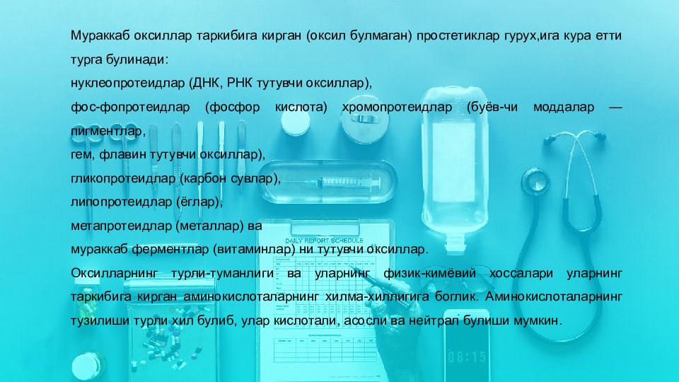 Мураккаб оксиллар таркибига кирган ( оксил булмаган ) простетиклар гурух,ига кура етти турга булинади : нуклеопротеидлар (ДНК, РНК тутувчи оксиллар ), фос-фопротеидлар (фосфор кислота) хромопротеидлар (буёв- чи моддалар — пигментлар, гем, флавин тутувчи оксиллар ), гликопротеидлар (карбон сувлар ), липопротеидлар ( ёглар ), метапротеидлар ( металлар ) ва мураккаб ферментлар ( витаминлар ) ни тутувчи оксиллар. Оксилларнинг турли-туманлиги ва уларнинг физик- кимёвий хоссалари уларнинг таркибига кирган аминокислоталарнинг хилма-хиллигига боглик. Аминокислоталарнинг тузилиши турли хил булиб, улар кислотали, асосли ва нейтрал булиши мумкин.