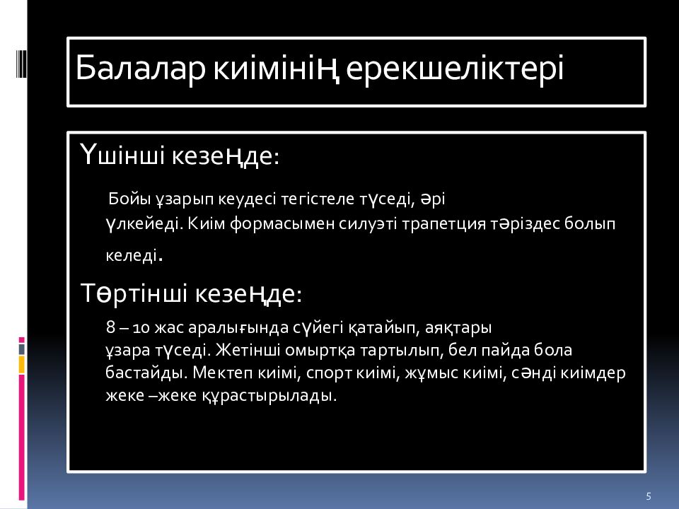 Үшінші кезеңде: Бойы ұзарып кеудесі тегістеле түседі, әрі үлкейеді. Киім формасымен силуэті трапетция тәріздес болып келеді. Төртінші кезеңде: 8 – 10 жас аралығында сүйегі қатайып, аяқтары ұзара түседі. Жетінші омыртқа тартылып, бел пайда бола бастайды. Мектеп киімі, спорт киімі, жұмыс киімі, сәнді киімдер жеке – жеке құрастырылады. 5