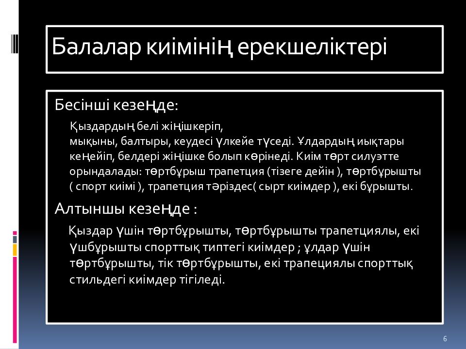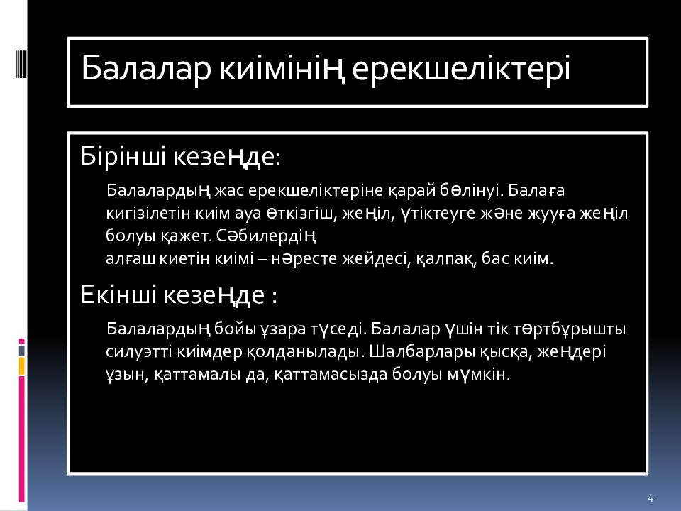 Бірінші кезеңде: Балалардың жас ерекшеліктеріне қарай бөлінуі. Балаға кигізілетін киім ауа өткізгіш, жеңіл, үтіктеуге және жууға жеңіл болуы қажет. Сәбилердің алғаш киетін киімі – нәресте жейдесі, қалпақ, бас киім. Екінші кезеңде : Балалардың бойы ұзара түседі. Балалар үшін тік төртбұрышты силуэтті киімдер қолданылады. Шалбарлары қысқа, жеңдері ұзын, қаттамалы да, қаттамасызда болуы мүмкін. 4