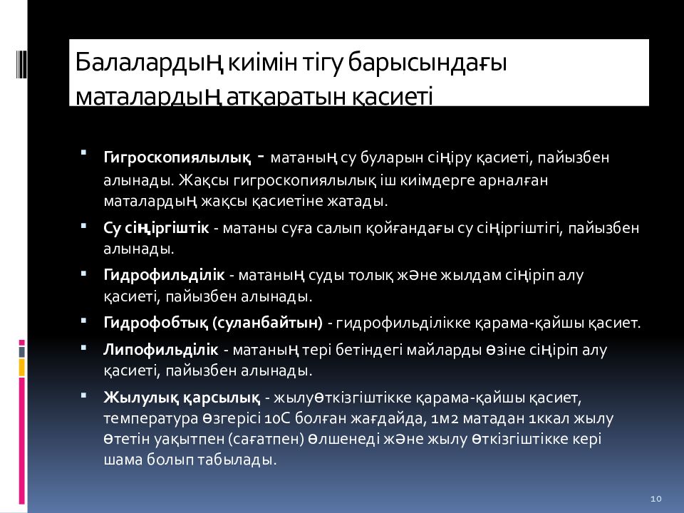 Слайд 10: Балалардың киімін тігу барысындағы маталардың атқаратын қасиеті