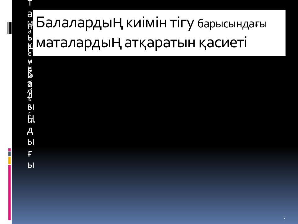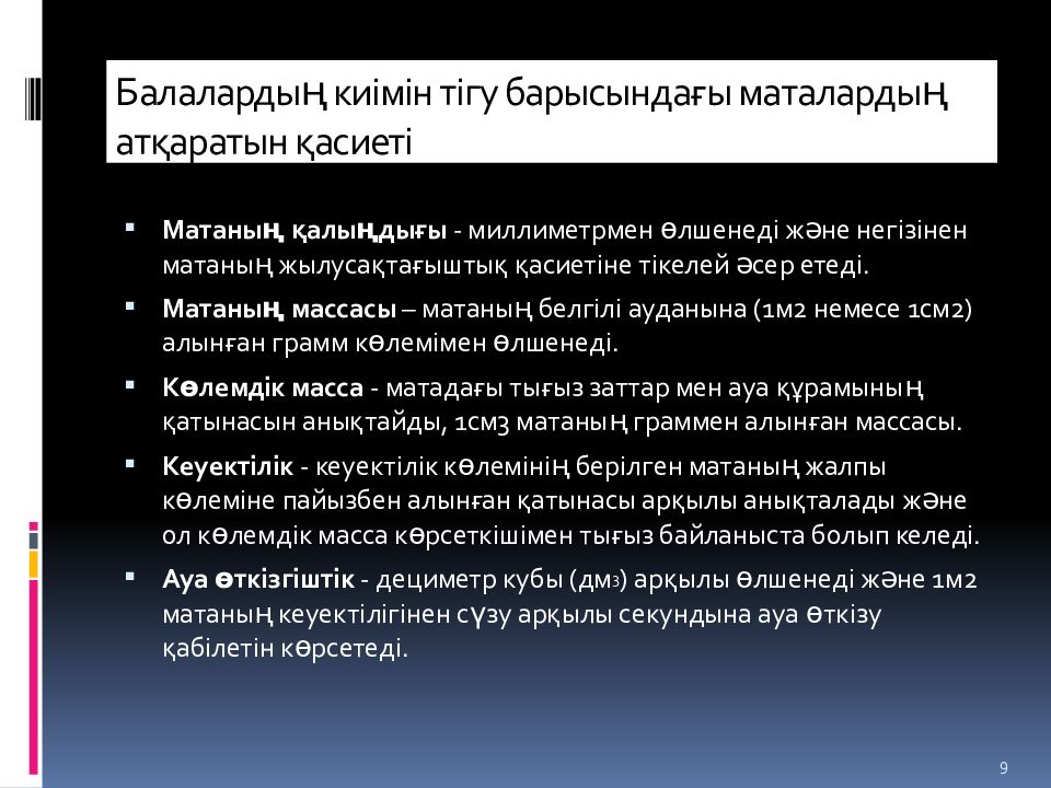 Слайд 9: Балалардың киімін тігу барысындағы маталардың атқаратын қасиеті