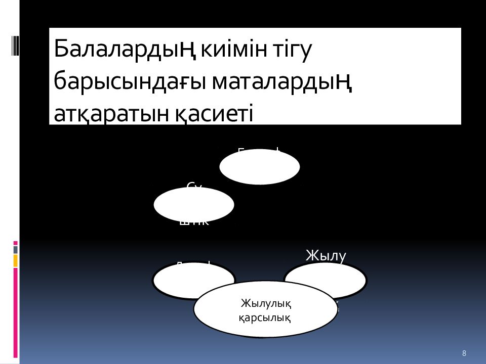 Слайд 8: Балалардың киімін тігу барысындағы маталардың атқаратын қасиеті