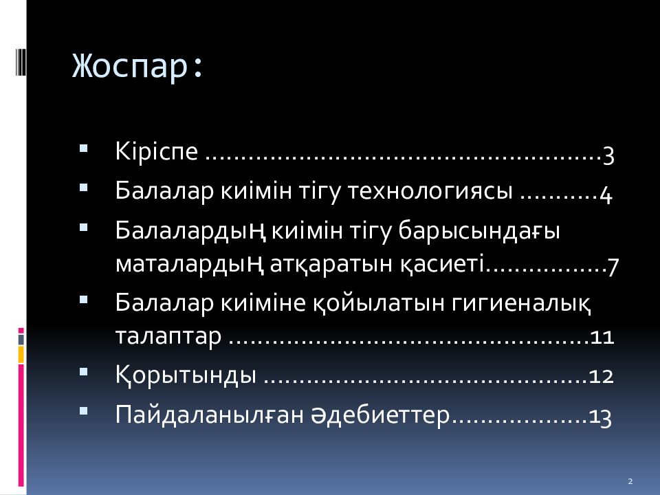 Кіріспе.......................................................3 Балалар киімін тігу технологиясы...........4 Балалардың киімін тігу барысындағы маталардың атқаратын қасиеті.................7 Балалар киіміне қойылатын гигиеналық талаптар..................................................11 Қорытынды.............................................12 Пайдаланылған әдебиеттер...................13 2