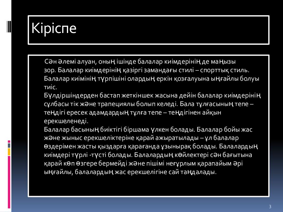 Сән әлемі алуан, оның ішінде балалар киімдерінің де маңызы зор. Балалар киімдерінің қазіргі замандағы стилі – спорттық стиль. Балалар киімінің түрпішіні олардың еркін қозғалуына ыңғайлы болуы тиіс. Бүлдіршіндерден бастап жеткіншек жасына дейін балалар киімдерінің сұлбасы тік және трапециялы болып келеді. Бала тұлғасының тепе – теңдігі ересек адамдардың тұлға тепе – теңдігінен айқын ерекшеленеді. Балалар басының биіктігі біршама үлкен болады. Балалар бойы жас және жыныс ерекшеліктеріне қарай ажыратылады – ұл балалар өздерімен жасты қыздарға қарағанда ұзынырақ болады. Балалардың киімдері түрлі - түсті болады. Балалардың көйлектері сән бағытына қарай көп өзгере бермейді және пішімі неғұрлым қарапайым әрі ыңғайлы, балалардың жас ерекшелігіне сай таңдалады. 3