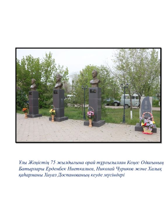 Ұлы Жеңістің 75 жылдығына орай тұрғызылған Кеңес Одағының Батырлары Ерденбек Ниеткалиев, Николай Чуриков және Халық қаһарманы Хиуаз Доспанованың кеуде мүсіндері