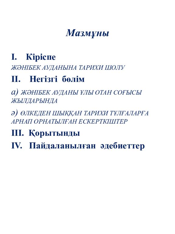 I. Кіріспе ЖӘНІБЕК АУДАНЫНА ТАРИХИ ШОЛУ II. Негізгі бөлім а ) ЖӘНІБЕК АУДАНЫ ҰЛЫ ОТАН СОҒЫСЫ ЖЫЛДАРЫНДА ә) ӨЛКЕДЕН ШЫҚҚАН ТАРИХИ ТҰЛҒАЛАРҒА АРНАП ОРНАТЫЛҒАН ЕСКЕРТКІШТЕР III. Қорытынды IV. Пайдаланылған әдебиеттер