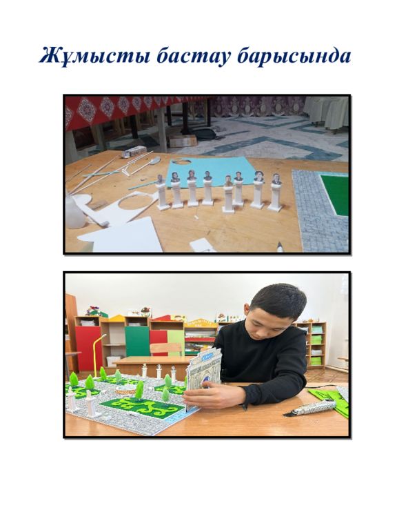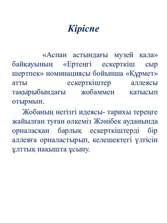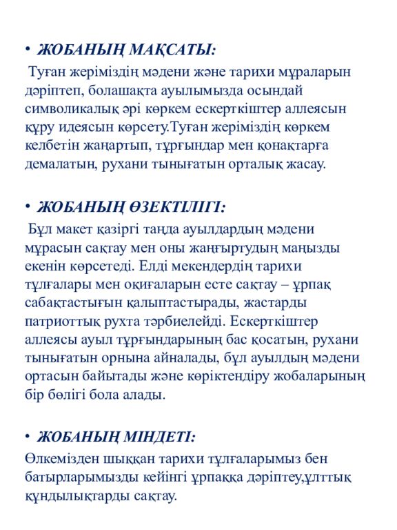 ЖОБАНЫҢ МАҚСАТЫ : Туған жеріміздің мәдени және тарихи мұраларын дәріптеп, болашақта ауылымызда осындай символикалық әрі көркем ескерткіштер аллеясын құру идеясын көрсету.Туған жеріміздің көркем келбетін жаңартып, тұрғындар мен қонақтарға демалатын, рухани тынығатын орталық жасау. ЖОБАНЫҢ ӨЗЕКТІЛІГІ: Бұл макет қазіргі таңда ауылдардың мәдени мұрасын сақтау мен оны жаңғыртудың маңызды екенін көрсетеді. Елді мекендердің тарихи тұлғалары мен оқиғаларын есте сақтау – ұрпақ сабақтастығын қалыптастырады, жастарды патриоттық рухта тәрбиелейді. Ескерткіштер аллеясы ауыл тұрғындарының бас қосатын, рухани тынығатын орнына айналады, бұл ауылдың мәдени ортасын байытады және көріктендіру жобаларының бір бөлігі бола алады. ЖОБАНЫҢ МІНДЕТІ: Өлкемізден шыққан тарихи тұлғаларымыз бен батырларымызды кейінгі ұрпаққа дәріптеу,ұлттық құндылықтарды сақтау.