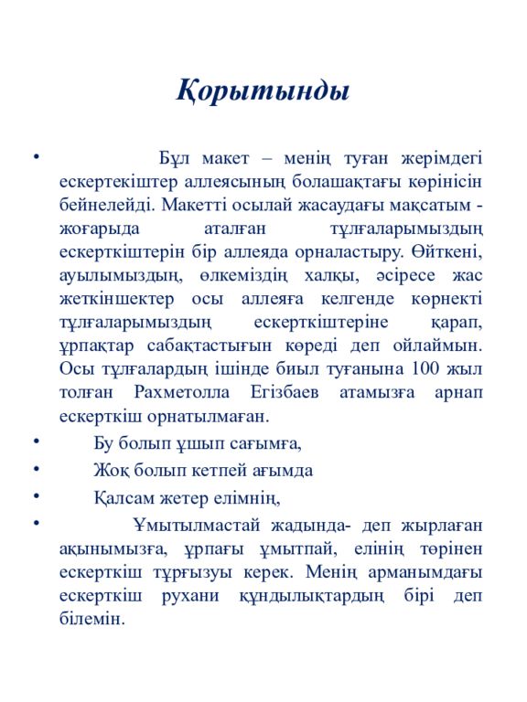Бұл макет – менің туған жерімдегі ескертекіштер аллеясының болашақтағы көрінісін бейнелейді. Макетті осылай жасаудағы мақсатым - жоғарыда аталған тұлғаларымыздың ескерткіштерін бір аллеяда орналастыру. Өйткені, ауылымыздың, өлкеміздің халқы, әсіресе жас жеткіншектер осы аллеяға келгенде көрнекті тұлғаларымыздың ескерткіштеріне қарап, ұрпақтар сабақтастығын көреді деп ойлаймын. Осы тұлғалардың ішінде биыл туғанына 100 жыл толған Рахметолла Егізбаев атамызға арнап ескерткіш орнатылмаған. Бу болып ұшып сағымға, Жоқ болып кетпей ағымда Қалсам жетер елімнің, Ұмытылмастай жадында - деп жырлаған ақынымызға, ұрпағы ұмытпай, елінің төрінен ескерткіш тұрғызуы керек. Менің арманымдағы ескерткіш рухани құндылықтардың бірі деп білемін.