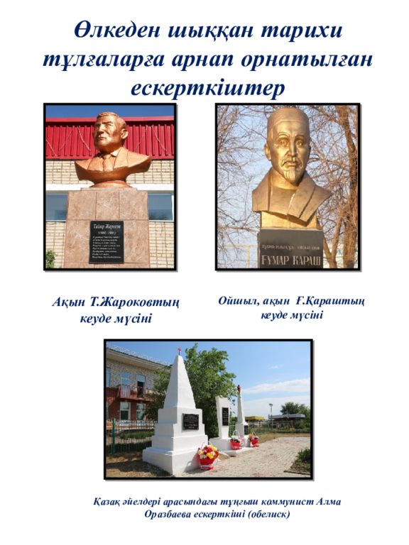 Ақын Т.Жароковтың кеуде мүсіні Ойшыл, ақын Ғ.Қараштың кеуде мүсіні Қазақ әйелдері арасындағы тұңғыш коммунист Алма Оразбаева ескерткіші (обелиск)