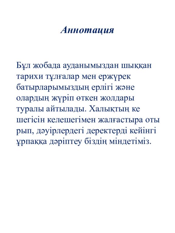 Бұл жобада ауданымыздан шыққан тарихи тұлғалар мен ержүрек батырларымыздың ерлігі және олардың жүріп өткен жолдары туралы айтылады. Халықтың кешегісін келешегімен жалғастыра отырып, дәуірлердегі деректерді кейінгі ұрпаққа дәріптеу біздің міндетіміз.