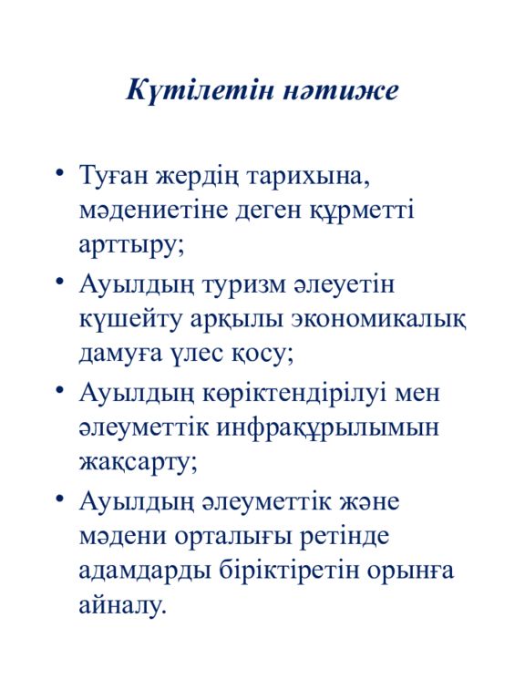 Туған жердің тарихына, мәдениетіне деген құрметті арттыру; Ауылдың туризм әлеуетін күшейту арқылы экономикалық дамуға үлес қосу; Ауылдың көріктендірілуі мен әлеуметтік инфрақұрылымын жақсарту; Ауылдың әлеуметтік және мәдени орталығы ретінде адамдарды біріктіретін орынға айналу.