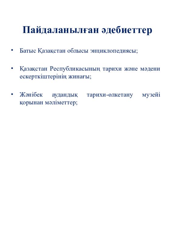 Последний слайд презентации: БАТЫС ҚАЗАҚСТАН ОБЛЫСЫ ӘКІМДІГІ БІЛІМ БАСҚАРМАСЫНЫҢ ЖӘНІБЕК АУДАНЫ БІЛІМ БЕРУ: Пайдаланылған әдебиеттер