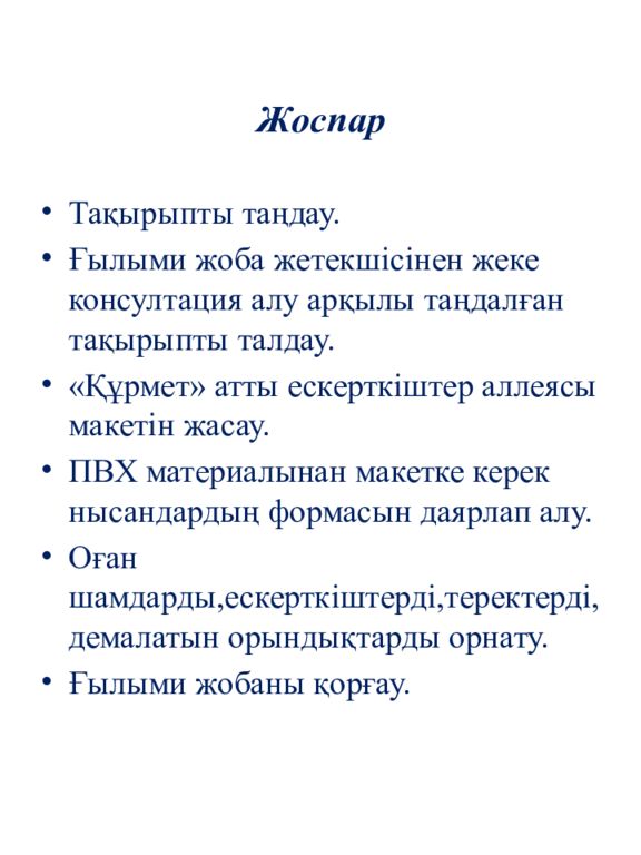 Тақырыпты таңдау. Ғылыми жоба жетекшісінен жеке консултация алу арқылы таңдалған тақырыпты талдау. «Құрмет» атты ескерткіштер аллеясы макетін жасау. ПВХ материалынан макетке керек нысандардың формасын даярлап алу. Оған шамдарды,ескерткіштерді,теректерді, демалатын орындықтарды орнату. Ғылыми жобаны қорғау.