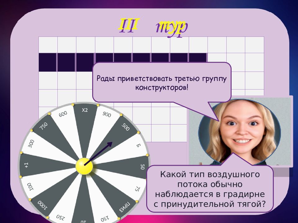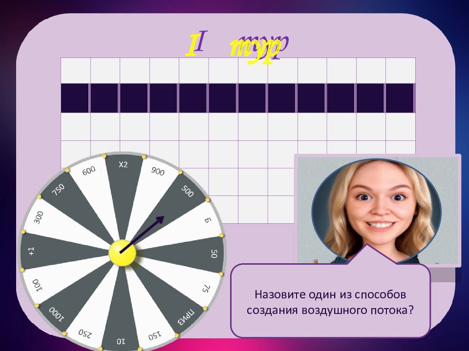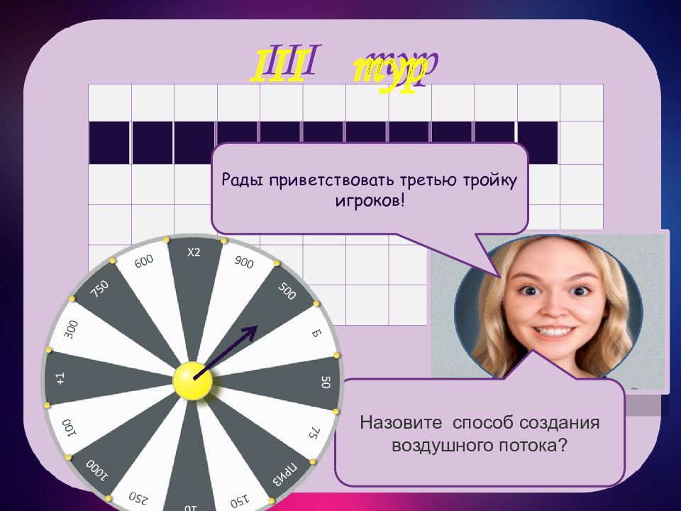 III тур III тур м о с ф е р н т а ы й Рады приветствовать третью тройку игроков! Назовите способ создания воздушного потока?
