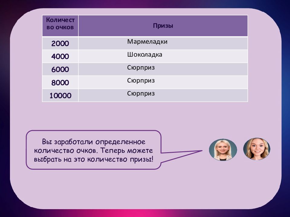 Количество очков Призы 2000 Мармеладки 4000 Шоколадка 6000 Сюрприз 8000 Сюрприз 10000 Сюрприз Вы заработали определенное количество очков. Теперь можете выбрать на это количество призы!