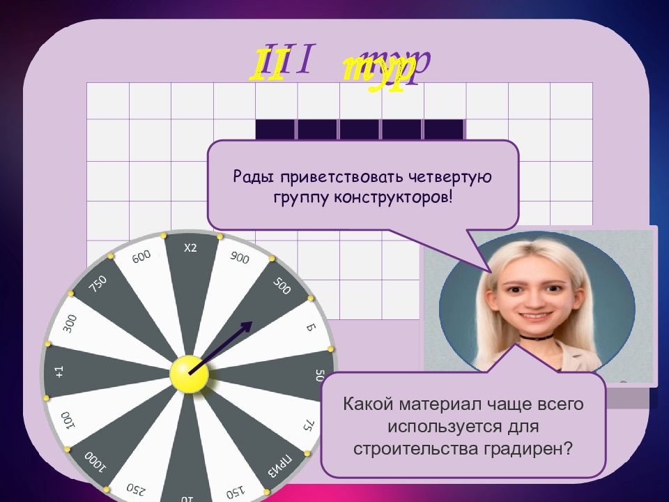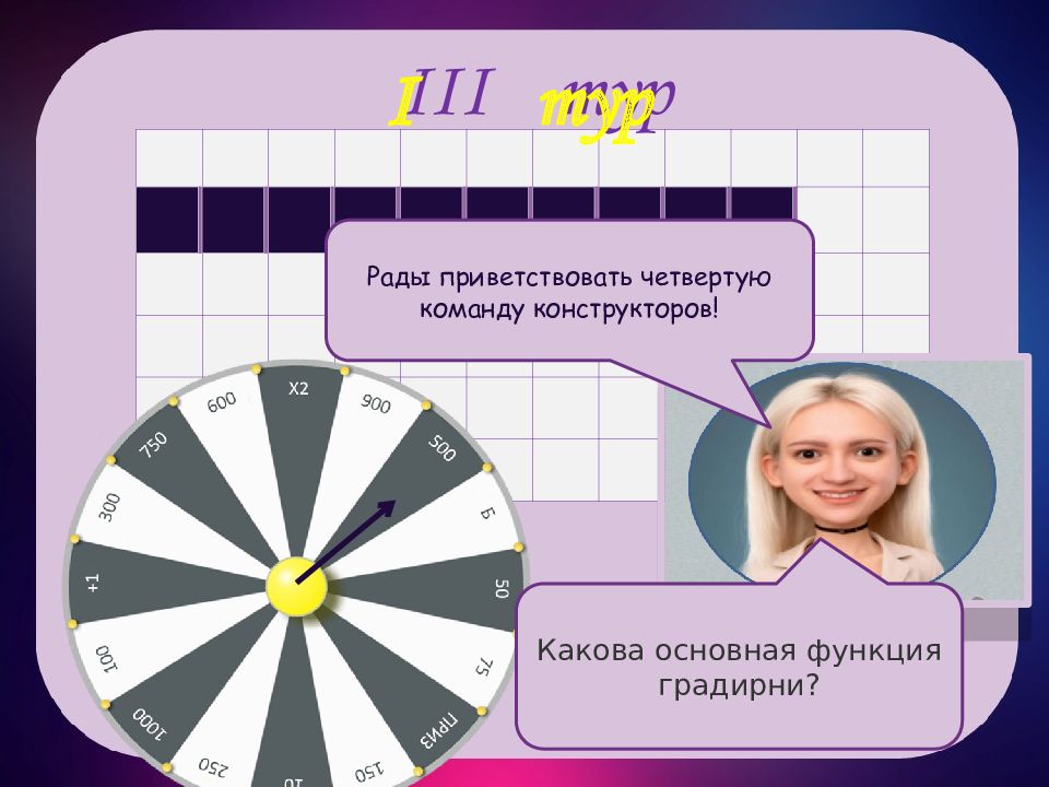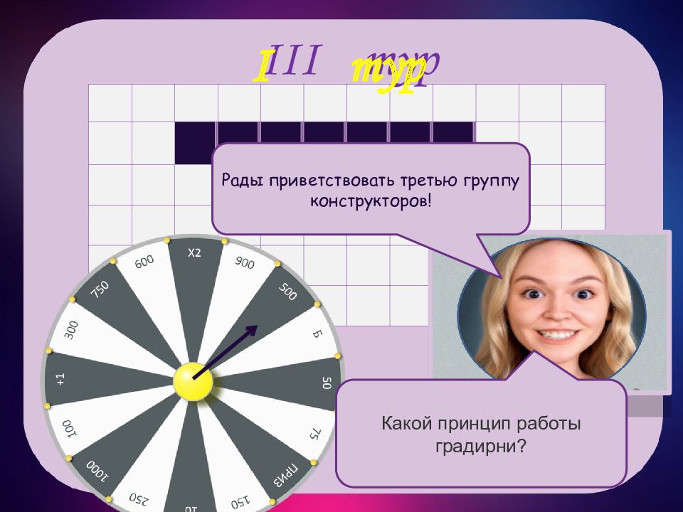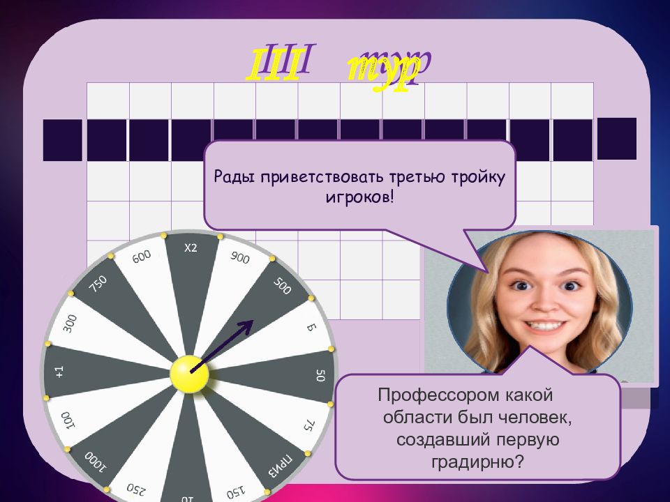 III тур III тур и н о с т р о ш е н а и я м Рады приветствовать третью тройку игроков! Профессором какой области был человек, создавший первую градирню?