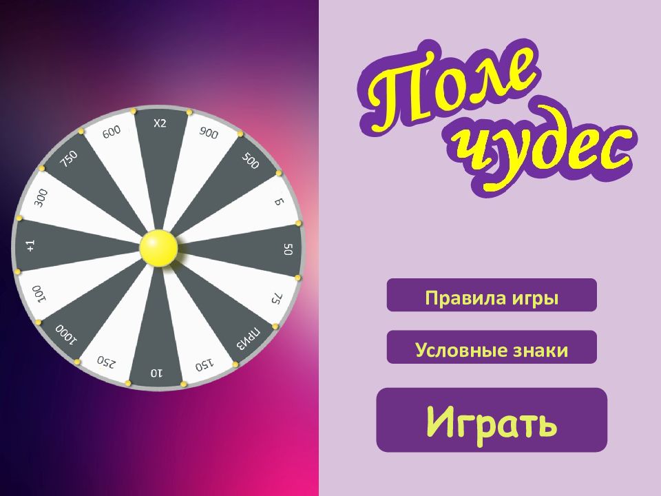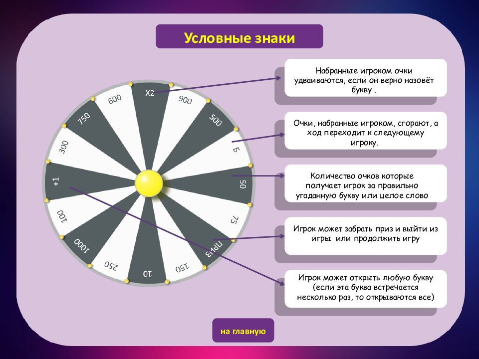 Условные знаки на главную Набранные игроком очки удваиваются, если он верно назовёт букву. Очки, набранные игроком, сгорают, а ход переходит к следующему игроку. Количество очков которые получает игрок за правильно угаданную букву или целое слово Игрок может открыть любую букву (если эта буква встречается несколько раз, то открываются все) Игрок может забрать приз и выйти из игры или продолжить игру