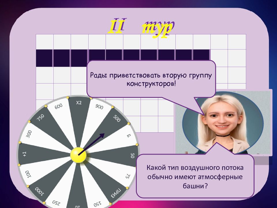 II тур II тур п о п е р е ч н ы й Какой тип воздушного потока обычно имеют атмосферные башни ? Рады приветствовать вторую группу конструкторов!