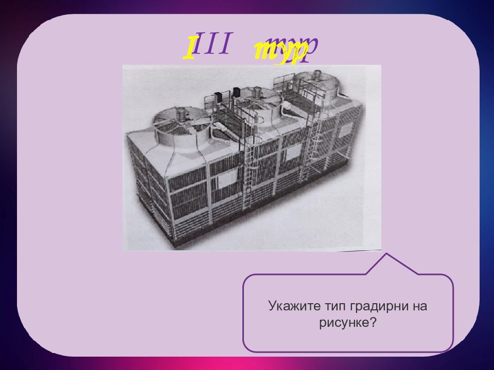 III тур I тур с е к т о р н ы й Рады приветствовать третью тройку игроков! Укажите тип градирни на рисунке?