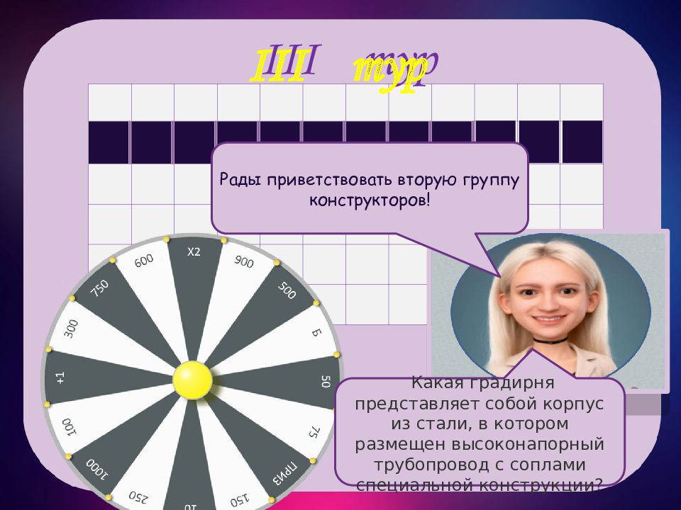 III тур III тур э к ж е к ц и о н Какая градирня представляет собой корпус из стали, в котором размещен высоконапорный трубопровод с соплами специальной конструкции? н а я Рады приветствовать вторую группу конструкторов!