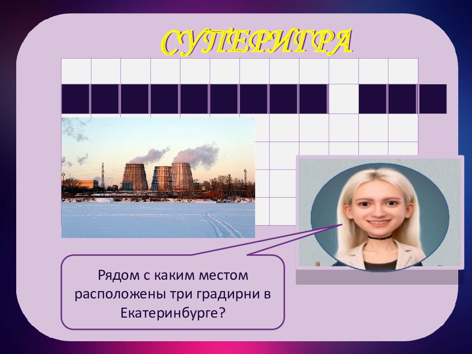 СУПЕРИГРА СУПЕРИГРА т а г а н с к и й д р я Рядом с каким местом расположены три градирни в Екатеринбурге?