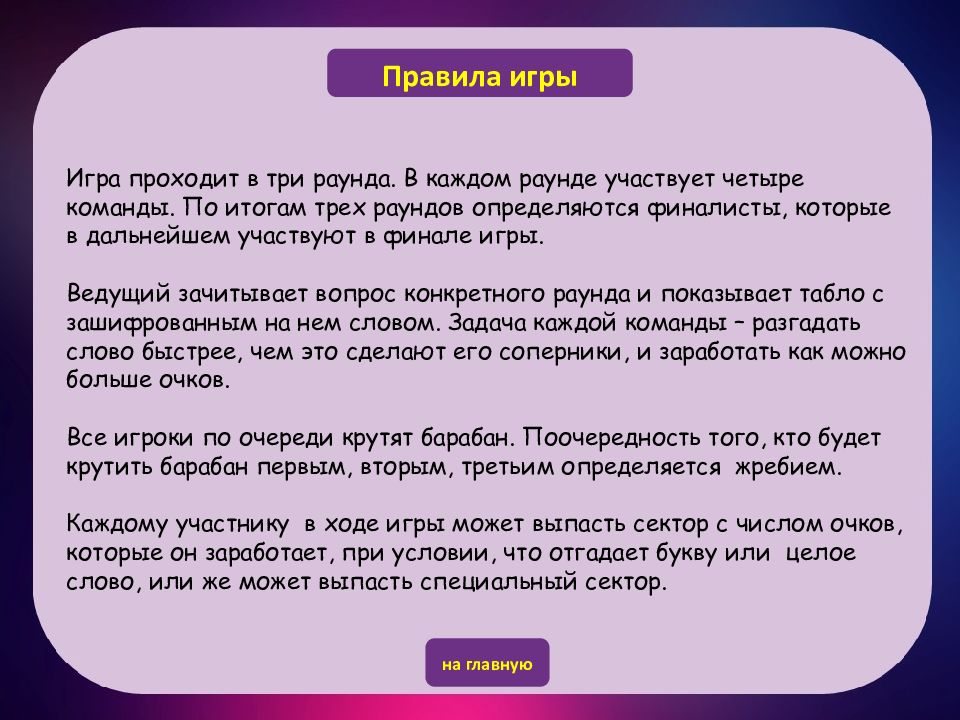 Игра проходит в три раунда. В каждом раунде участвует четыре команды. По итогам трех раундов определяются финалисты, которые в дальнейшем участвуют в финале игры. Ведущий зачитывает вопрос конкретного раунда и показывает табло с зашифрованным на нем словом. Задача каждой команды – разгадать слово быстрее, чем это сделают его соперники, и заработать как можно больше очков. Все игроки по очереди крутят барабан. Поочередность того, кто будет крутить барабан первым, вторым, третьим определяется жребием. Каждому участнику в ходе игры может выпасть сектор с числом очков, которые он заработает, при условии, что отгадает букву или целое слово, или же может выпасть специальный сектор. Правила игры на главную