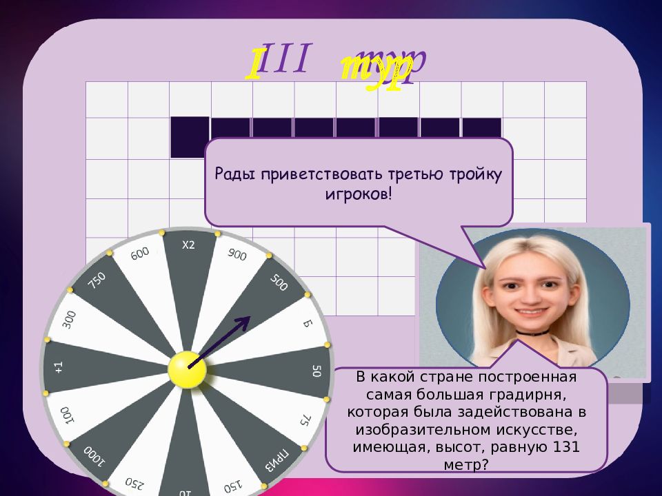 и я III тур I тур е р м а н В какой стране построенная самая большая градирня, которая была задействована в изобразительном искусстве, имеющая, высот, равную 131 метр? г и я Рады приветствовать третью тройку игроков!