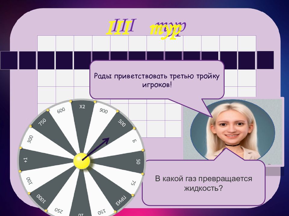 III тур III тур т е р м и ч е о д с к и н й э Рады приветствовать третью тройку игроков! В какой газ превращается жидкость?